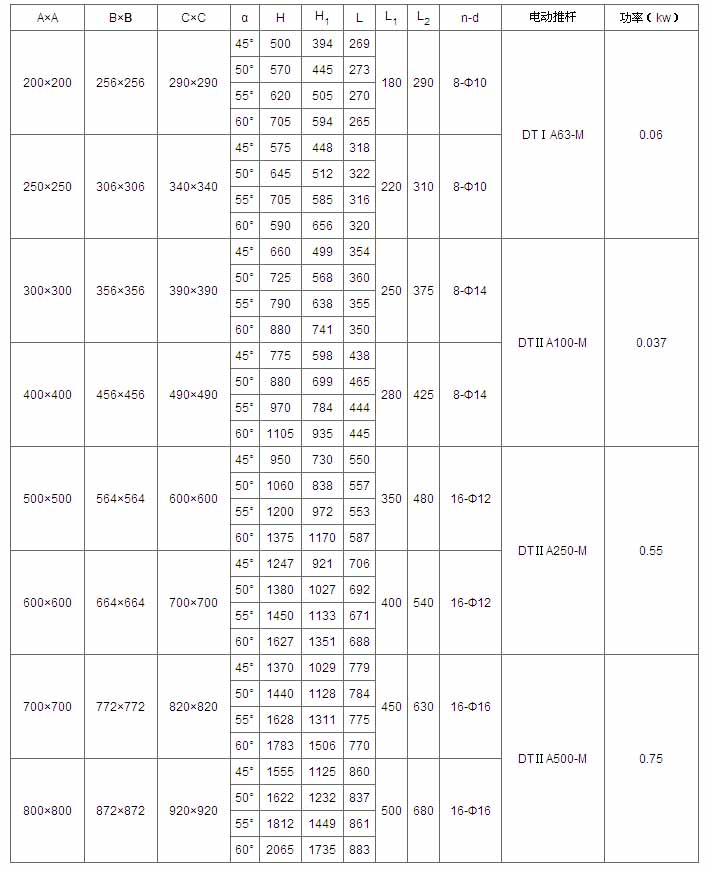 A×A | B×B | C×C | α | H | L | L1 | L2 | n-d | 電動(dòng)裝置 | 功率(kw) |