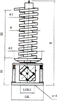 ZC系列垂直振動輸送機的驅動裝置振動電機安裝在輸送塔下部,兩臺振動電機對稱交叉安裝,輸送塔由管體和焊接在管體周圍的螺旋輸送槽組成,輸送塔座于減振裝置上,減振裝置由底座和隔振彈簧組成。(見圖一)當垂直輸送機工作時,根據雙振動電機自同步原理,由振動電機產生激振力,強迫整個輸送塔體作水平圓運動和向上垂直運動的空間復合振動,螺旋槽內的物料則受輸送槽的作用,作勻速拋擲圓運動,沿輸送槽體向上運動,從而完成物料的向上(或向下)輸送作業(yè)。